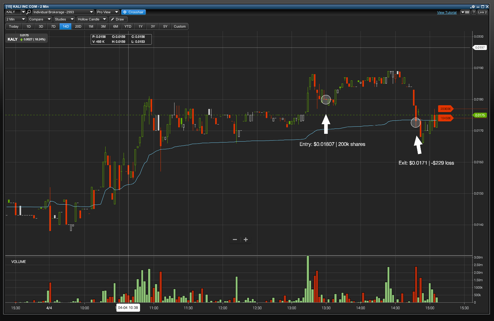 I dip bought this OTC spiker on the D of the ABCD pattern on its 1st green day with considerable volume. The goal was to sell into an EOD uptrend or spike, but I ended up cutting my losses as the volume faded and the stock followed suit and cracked support. I got caught up in some illiquid OTC slippage and took another 2-3 % of a loss than I wanted.