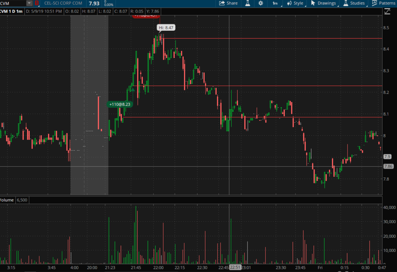 Note: P/L (less commission); Entry Reason: I was confident to enter after breaking the high at 7.5 because of the solid news last day "Received $9.6M from conversion of warrants", plus this ticker has got a score of 73 in my Stock trader. I placed my mental stoploss (less than 2% risk) with a target profit of 10%. Exit Reason: I was scary about small candles at 8.4ish and decided to exit quickly at 8.451.