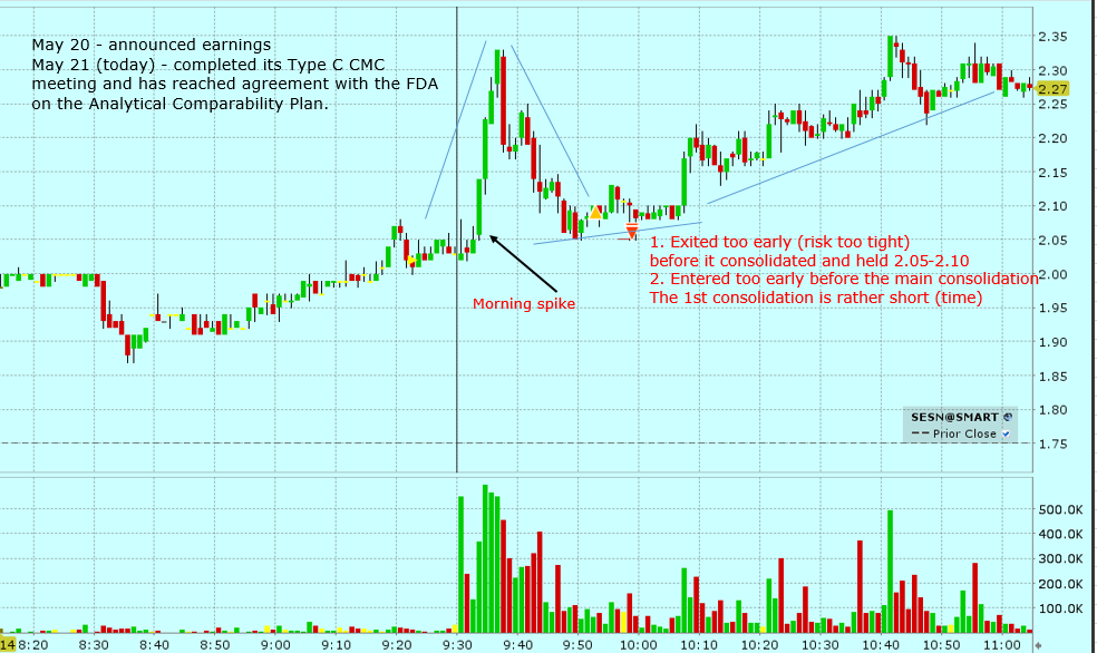 Stock broke $1.50 recent level and closed strong yest. Today it gapped up >1.5mil pre-m and had a morn spike! Waited for the dip and consolidation before re-entry but risk was too tight, shaken out right at the risk level to see the stock uptrending towards the goal of retesting morning highs...grr.. (Classic ABCD Pattern)