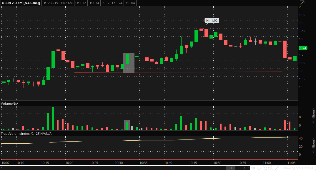 **FIRST TRADE SINCE BECOMING A STUDENT** so of course my heart was going crazy. Entry comment: Good volume market open. Saw the fake dip into a nice bounce and saw opportunity. Noticed OBLN could not brake above 1.70 at 9:38am. Patiently waited until 10:17 to enter at 1.76. Exit comment: After failing to brake 2 and consolidating around 1.80 I decided to get out while I still can. Was risking 0.13/share.