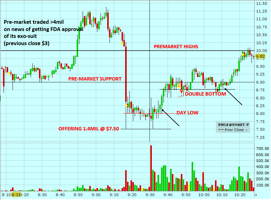 Going for potential 1st green day on low float - catalyst of FDA approval for exo-suit, ald up >300% pre-m (4mil vol). Stock dropped b4 market open on 1.4mil offering, as it ald traded 4mil it really didnt take long before 1.4mil was dried up. Not good at anticipating B/O (0.05 under B/O level) over pre-m support $9, would have better chance at morning day lows ($0.25 risk over offer px), or pull back at $8.75 key level when consolidation is tighter.