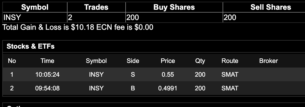 Bought in a little later into the morning spike for this stock, it wasn't initially on my watchlist so I missed a big chunk of the play/move. However, I did buy in on a super small position mainly because I wasn't sure how high it was going to reach so overall a par execution of about 10%. Did leave about .15 cents on the table as the stock did reach about .70 cents before pulling back late morning.