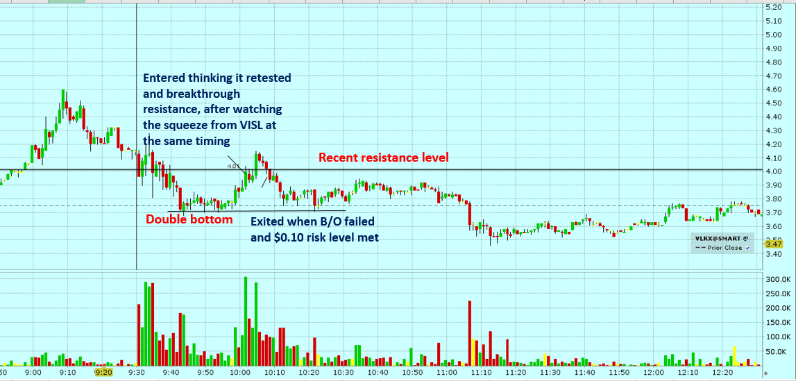 Premarket play - VLRX, 4mil biotech Co, traded almost 2mil pre-market, announced positive data from a retrospective study. Looking at strong market, squeeze on VISL (another pre-market play) - FOMO in play thinking once the stock breakout recent resistance $4 there are potential squeeze to pre-m high $4.60 to sell into strength. Immediately stuffed and exited at risk level determined. Stock fall below $4 rest of day.