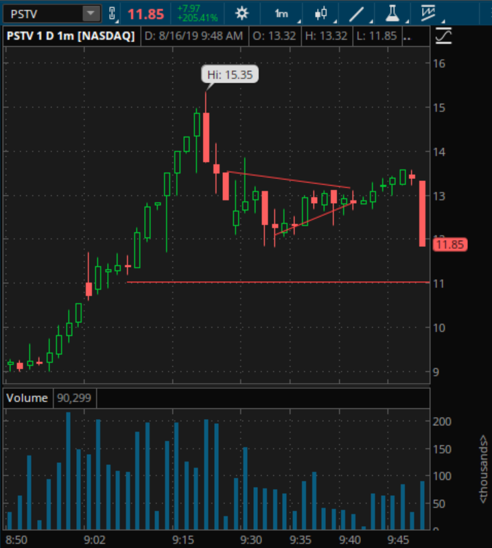 Huge morning gap from $3 previous day to $8 from earnings. Delayed run up to $15 from short squeeze+Momentum. Scan caught it at $12.50. Was tempted to chase momentum but decided a dip buy was the better. Entered 12.96 at 3rd bar green bar of bounce. Small bounce with poor entry timing. Stop loss triggered at 12.2, out at 12.11. Should've waited for definitive 3rd green bar. Too excited on entry, should be more patient for bottom.