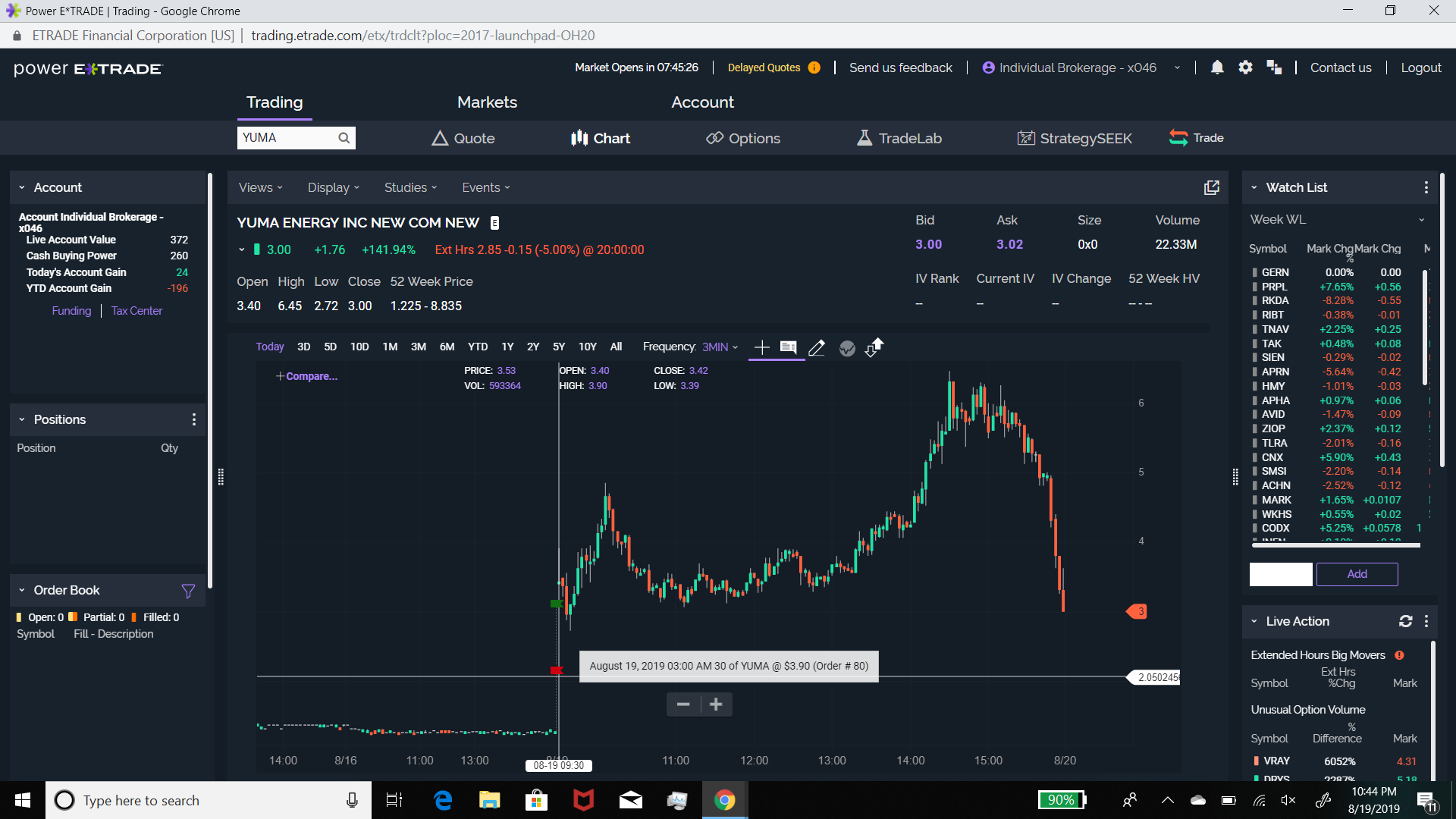 Small buy in on the dip, sold because it had already double topped then the stock kept surging! Played it safe and took my earnings. Perhaps I need more patience? Idc, traded scared! UPDATE: turns out this stock rocketed even further after lunch! I missed out! Also this proof has the buy and sell points marked out incorrectly but it's there anyways lol