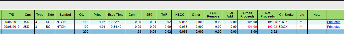 Shorted a lower high, risking 4.25 (hod.) My main thesis was that NTGN had a previous support area of 4.20 back in July which turned into resistance and they have an active ATM so I assumed the spike would get dumped into. My thesis was dead on and my entry was fairly good but I got scared out after a higher low was set. Next time I need to stick to my risk and let the chart play out. I can do better.