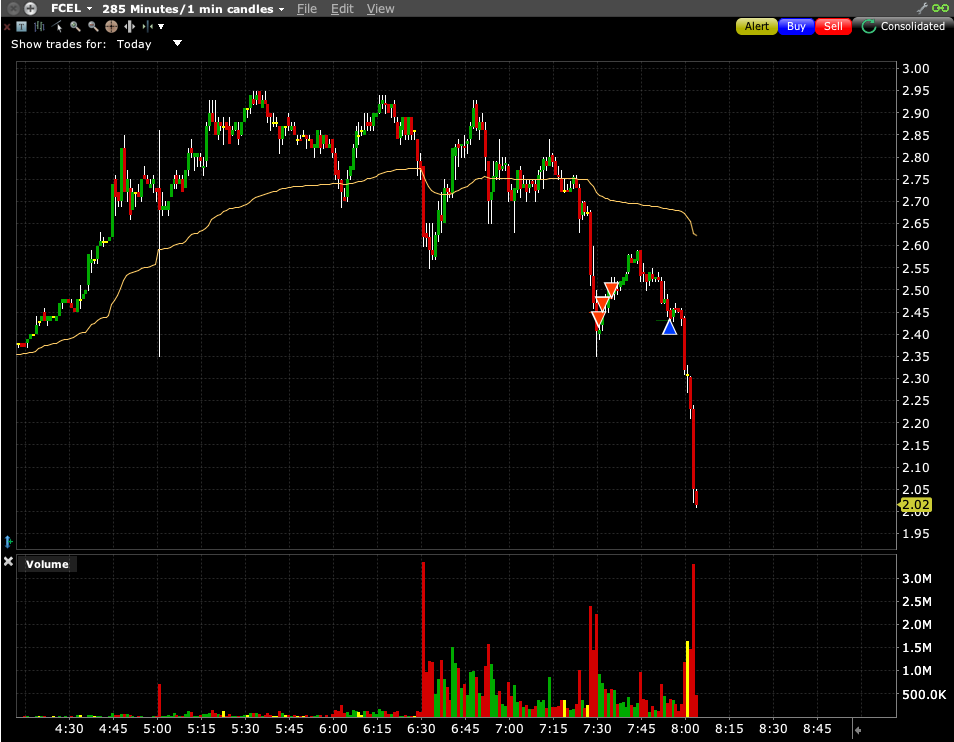 FCEL was on a multi day run and had a huge huge tank going red after a strong morning, I started in short too early, with only 100 shares but still too early, then could not stick to my plan by adding higher due to no shares at IB. but was ultimately right and got a wash to new LOD, should have been a little more patient for new LOD, massive tank the second time.