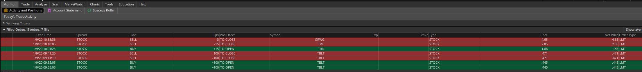 Recent Runner with a nice First Green Day after consolidation. $1.50 was the last green day's close (resistance). $1.74 was last green day's HOD (resistance #2). Price broke the $1.50 level pre-market. Opened strong breaking $1.74. HOD is $1.82. Waited for re-test of HOD, bought 15 shares @ $1.86. Held to $2.05 around pullback. Sold much too early, as TRIL squeezed hard.