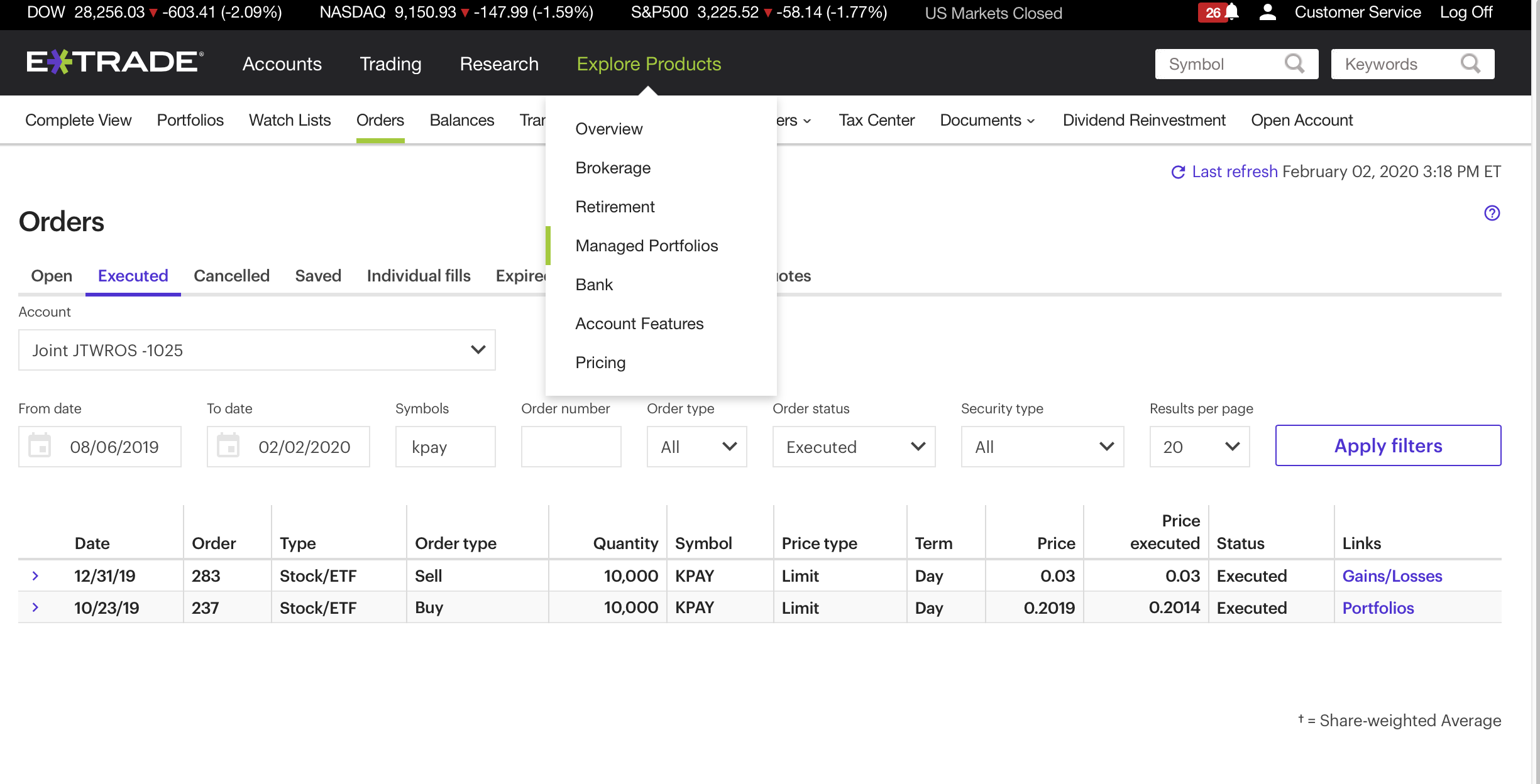 Ticker is KPAY - Followed Sykes into this play and bought at close of day expecting a spike. Next morning Sykes saw the stock dropping and immediately sold - I froze and did not - Overconfident - Thereafter made the worst decision to hold till next spike. THIS IS PROOF HOLD & HOPE DOES NOT WORK. Sold to take end of year loss for tax purpose.