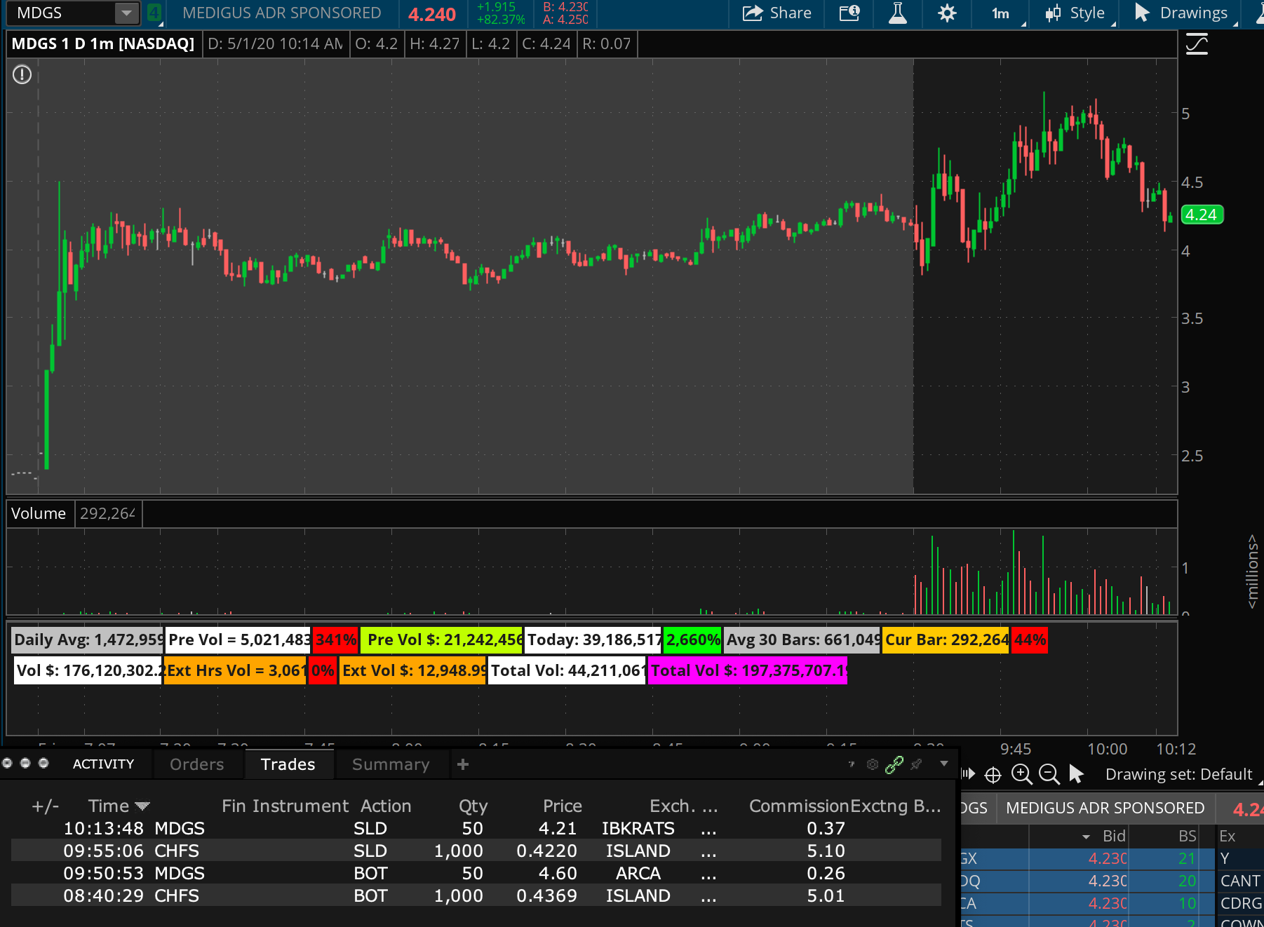 I saw this premarket and saw the consolidation but i didnt really trust it, after the market open when it spiked and pulled back down then started to spiked agian i almost bought 4.4 but doubted myself, it went up to like 5&pulled back& i bought small size thinking it would spike, i cut after it failed big