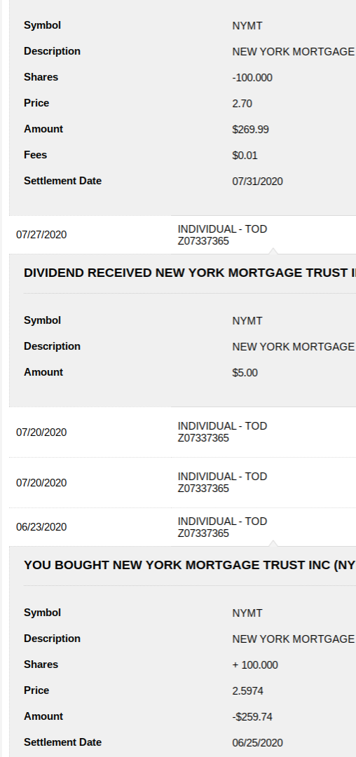 This was a long hold position, $NYMT was starting to make its way back up so I was hoping this would give me a good gain but unfortunately with the covid19 still hanging around and we are still in stage 1. I was hoping we were clear of this stage and maybe this stock could be higher. Maybe I will buy this back since a vaccine is coming near.