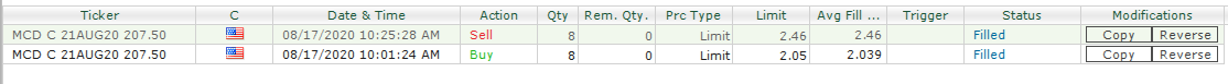 20.65% gain. Good standard trade; caught at the VR, sold at the BB. When selling, got half position filled on the first wave and half on the second one. Having to wait to get completely filled did not feel good! I am sitting at a 90.90% win rate in August (80% in July), but I will not let it get to my head. Every morning I say to myself that this is the day when my winning spree could finally be over. Best way to keep things flowing naturally.