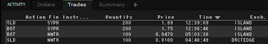 bought this on news from SST breaking news about a contract winner in Alberta. plan was to hold o/n if it stayed nice n clean till market close. it had some trouble getting into the 1.90s and after seeing 2.10 on the bid price while halted. if it couldnt even get back into the 2s... not what i was liking for price action so i got out luckily at 1.89 right before retracing down into the 1.50s. happy i took what i did. stick to your plan. trust your gut. one trade at a time. singles baby. singles