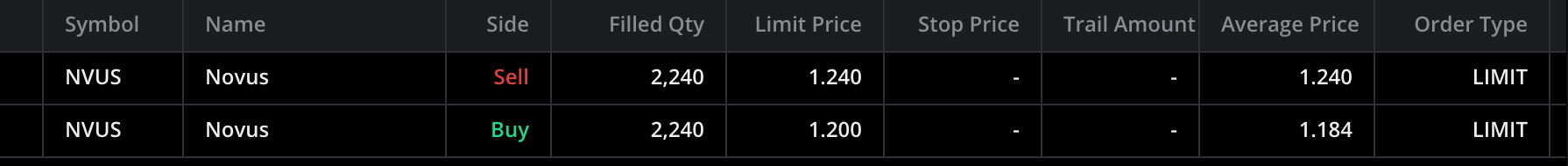 NVUS up on news of a deal with high volume and up massively on the day. Decided to get in based on strength at VWAP. My entry was quite good and I don't think I went into red numbers at all during my 4 minutes of trading. Exit wasnt great as I should have set it up properly hence why I only came out with 4.73% instead of the 5% that i am for but overall I am happy to get a green move to start my week