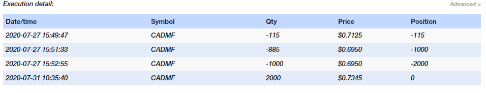 Gotta stop doing these now since my account is past PDT and well capitalized. I saw it was being flagged as promoted on OTCmarkets.com and decided to take a stab at it for a low risk short as IB had few shares. After getting sick of borrow fees from other plays I overnight-ed and wanting to have cash freed up for peace of mind and shorting other plays, I just took the mosquito bite loss and closed this out.