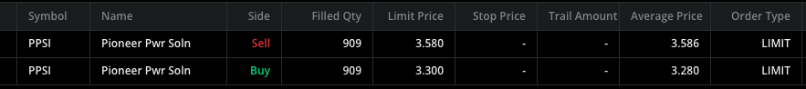 $PPSI up on volume for what I think is just a hot sector play. Loads of volume and strength in the price. I was watching it at VWAP and once I seen what I thought was a confirmed move to the upside I entered and was looking for my 5% gain. The stock spiked that quickly I exited with almost 10% which was great. Great to have my single biggest win right after my single biggest loss that was on ITRM. I really needed the confidence boost.
