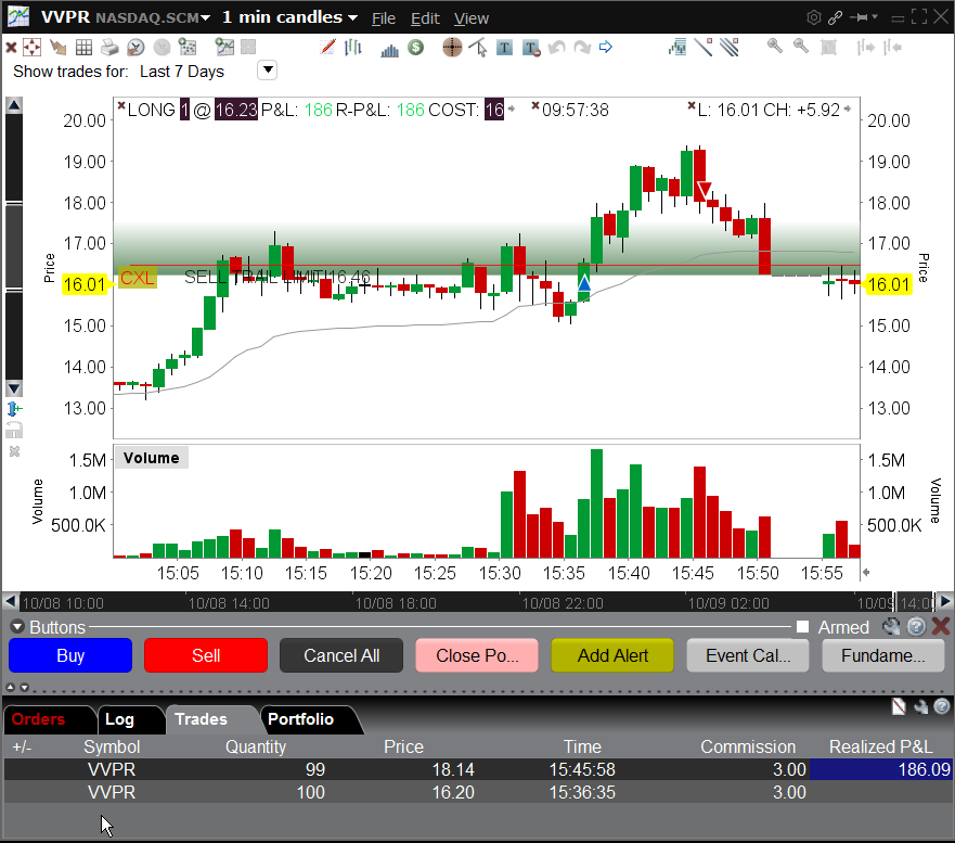 want to go on SNMP, but haltet so I moved on VVPR, left 1 open to see if a get my PDT -1 Trade if not complete sold Thank guys: @timbohen, @stockstotrade, @timothysykes