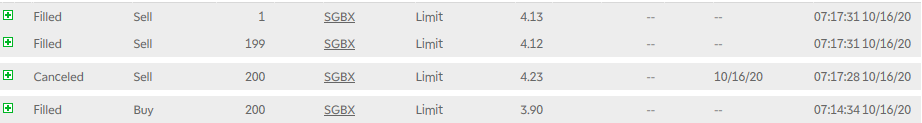SGBX Uptrending PM to deploy Charging stations it was approaching $4.00 so I bought $3.90 for it's breakout, my exit wasn't as great as it could of been, because I did not sell into the strength, so as it was dropping I was chasing to exit as you can see image of my trade. Went a little more aggressive buying more shares compare to my usual 100 in respect to trust myself into my plans.