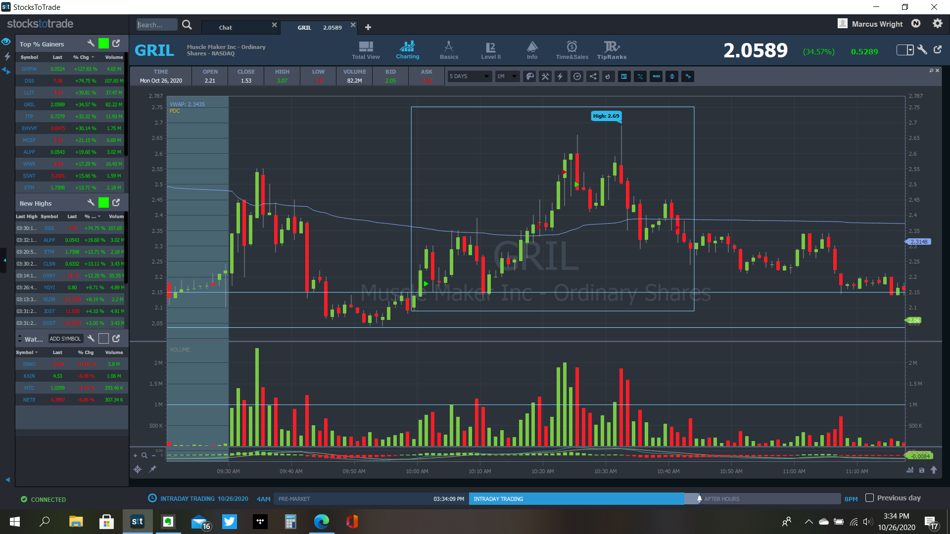 Trading goal is to gain 10% - 30%. Risk 2% - 5%. Pre-market ended at 2.22, with a key support level at 2.03. So I set my plan to see if it would dip under the support level, if it bounce/rip I would enter on the bounce past breakout level (2.15). Bought 26 shares past breakout level once it showed proof. Sold half position (13) to collect gains. Sell the rest if it continues to spike.