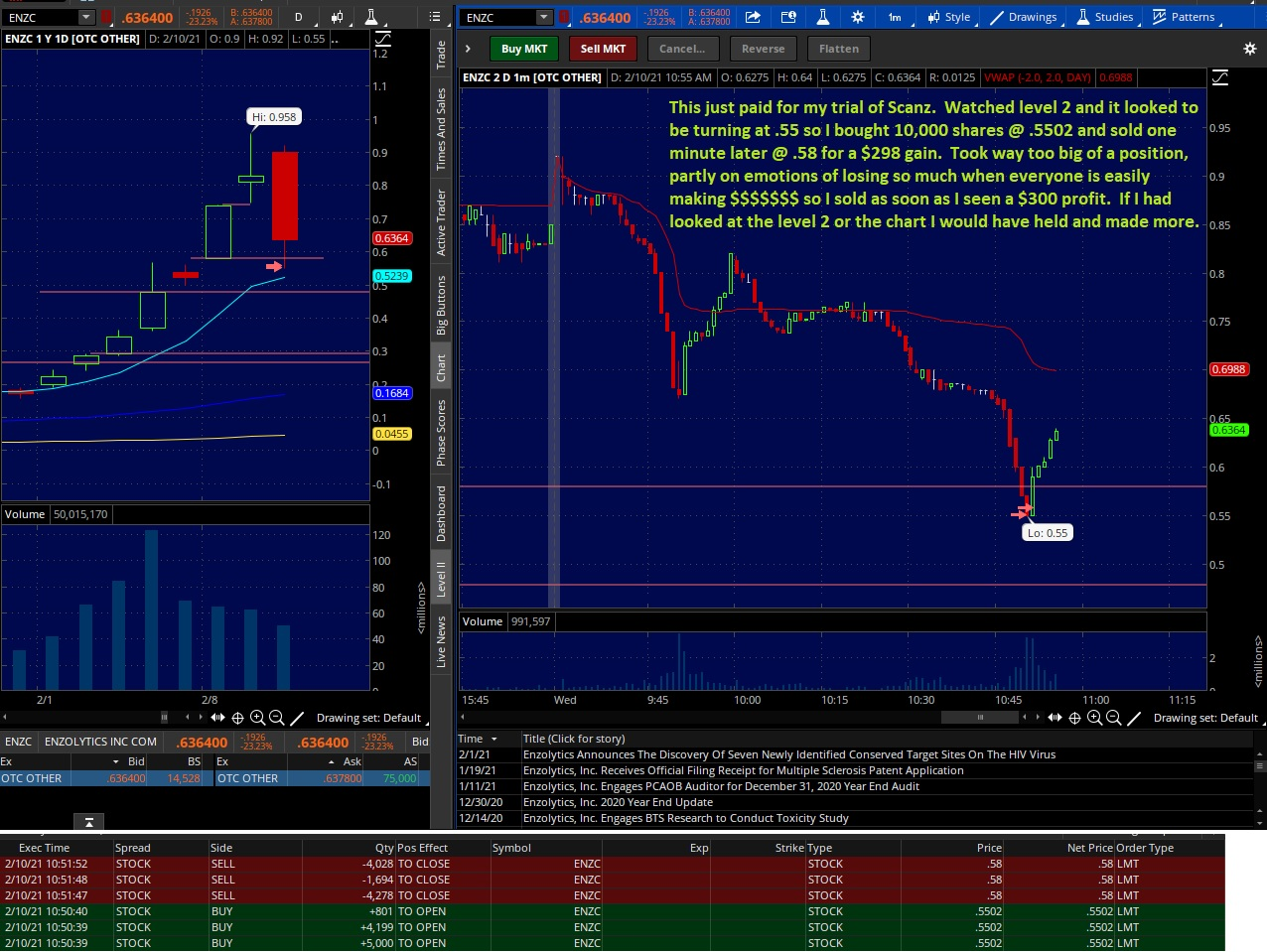Buying this panic dip buy at the bottom off level 2 action. This paid for my Scanz trial. I was disappointed I paid for a StocksToTrade trial and it didn't include level 2, which was the only reason I was paying for a trial, and it didn't say it didn't include it before I paid for the trial so had to get a trial of Scanz which seems worth it.