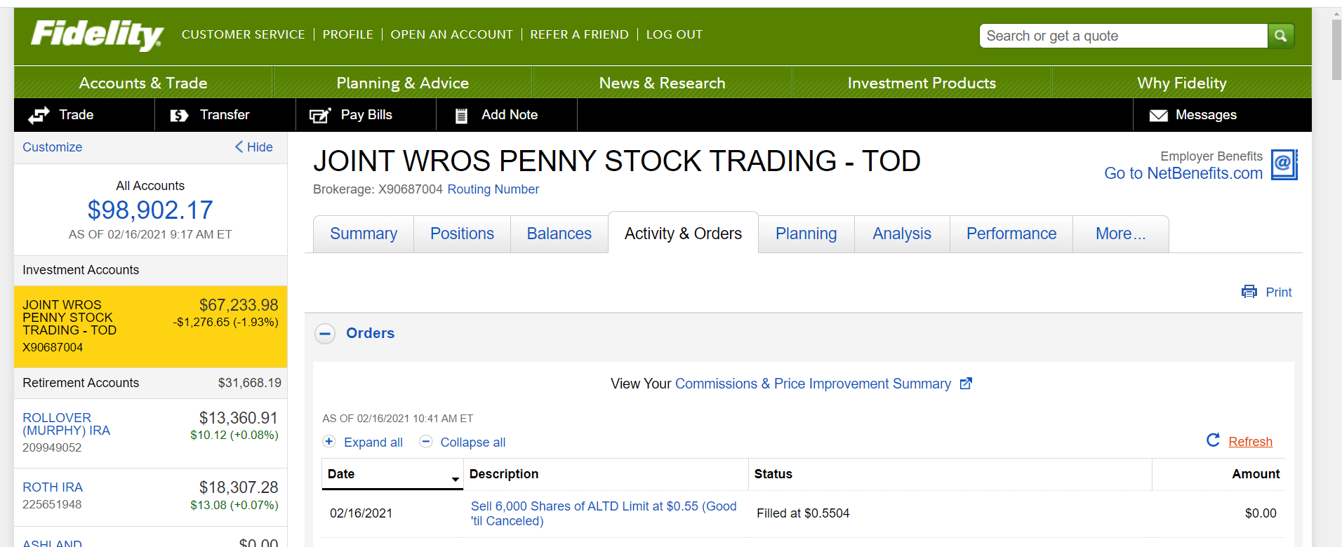 Dip bought 1/27 13:14 $0.4672 3k shares the 22% crack off HOD 13:13 $0.5995. Price kept falling so dip bought 13:16 $0.4028 3k for 6k shares total at $0.435 avg. Held more for the bubble market that we're in than my 10/31 Profitly blogpost strategy as this one is not very liquid. Watched it get progressively higher than me 2/10, 2/11, & 2/12. When it hit 2/16 $0.60 MDBO resistance and couldn't get through, I got out with what I could on the Bid 9:37/9:40 $0.5504.