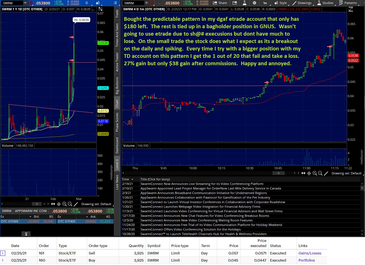 Bought the predictable pattern in my dgaf etrade account that only has $180 left. The rest is tied up in a bagholder position in GNUS. Wasn't going to use etrade due to sh@# execusions but dont have much to lose. On the small trade the stock does what I expect as its a breakout on the daily and spiking. Every time I try with a bigger position with my TD account on this pattern I get the 1 out of 20 that fail and take a loss. 27% gain but only $38 gain after commissions. Happy and annoyed.
