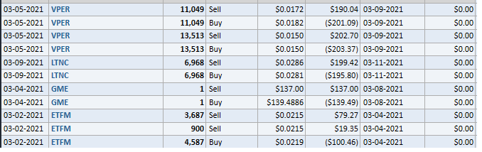 AVG of 2 trades, Basically i didn't buy the dip after its morning spike and it kept going then i tried to buy the dip but it looked to go lower so i got out and then midday it was uptrending nicely and i thought i tried to buy it on a dip but it just kept going lower and the spread was kinda nasty so i got out. Bad trades