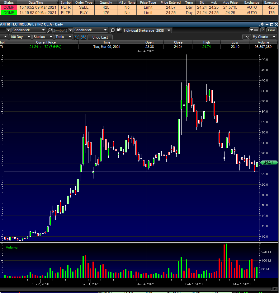 Swing trade plan changed when the NASDAQ sold off 600pts on a SPY/QQQ green day. Made an audible to double up (1.7 unit size add) into weakness or first pull after the 1:30pm intraday move. Added 175 shares at $24.25 with a goal of this getting back up through $24.66 before the end of the session. Gave it a chance and got out into strength in the afternoon at $24.57/share. Felt uncomfortable so I got out $24.57 with a profit, thinking that I could get back in lower.
