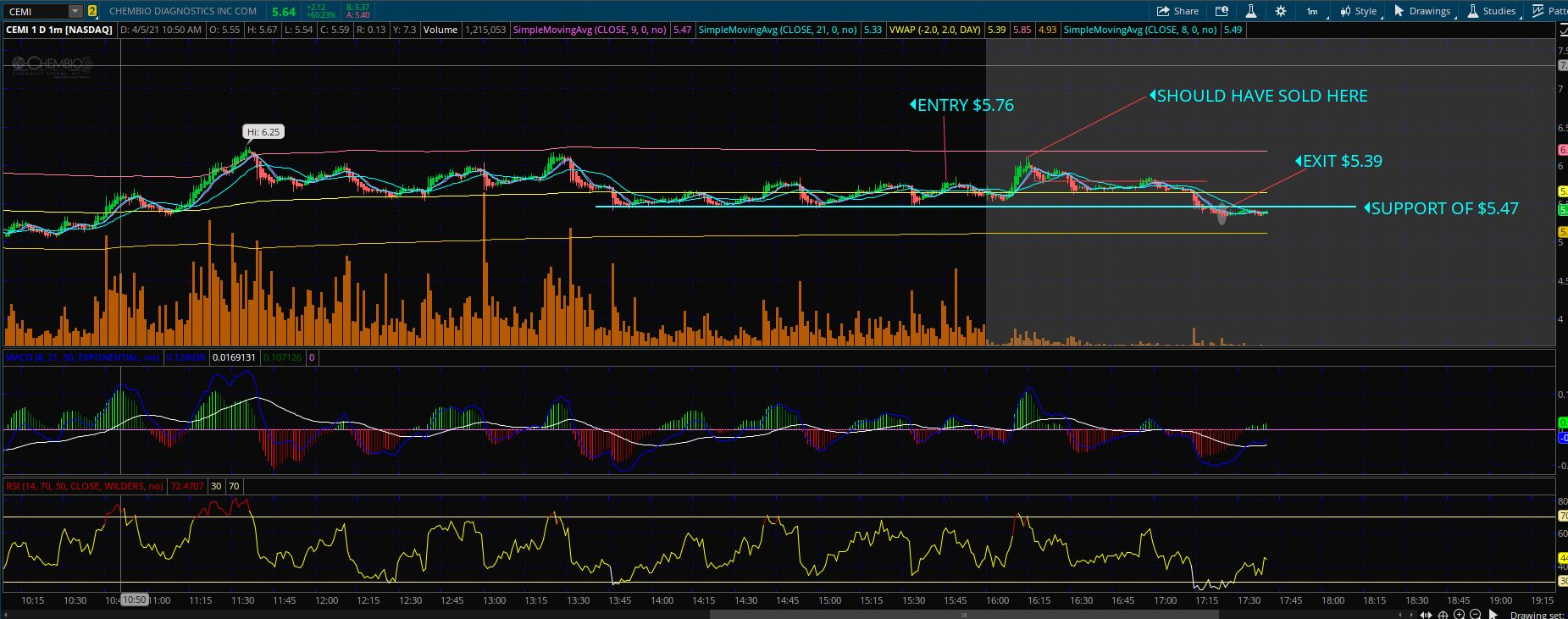 Observed bouncing off support level at $5.47 4 times. After the 4th, it went up over VWAP and made my entry at $5.76 and it broke out over resistance of $5.80 in AH. Had a small run up to $6.10. SHOULD HAVE SOLD THEN. Was anticipating another move up due to 15 day and 15 min charts looking good and possibly another next green day. Consolidation was around entry, so wasn't worried. Then at approximately 1715 hours, support was broken at $5.47. CUT LOSSES at 6%. Wasn't making a recovery.