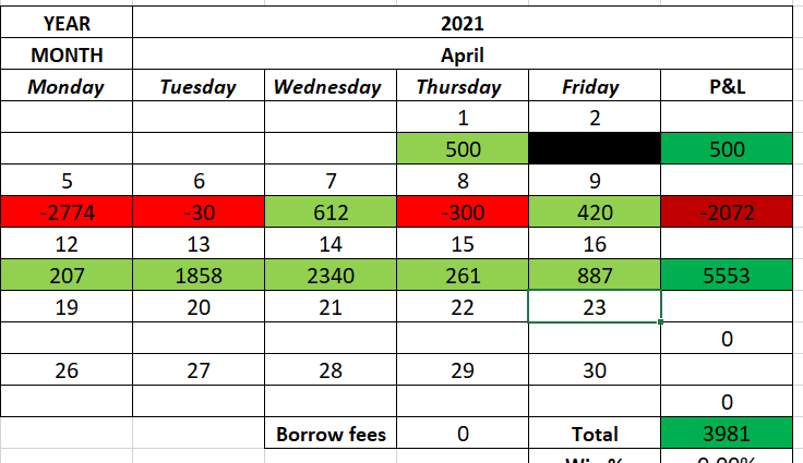 this is for the work of whole April until today, half of a month to be exact..... been a slowest week/month for the past several months. Trying to make money but also have to remember in the protect mode when market is slow. Wait for it to pick up again and the plays come back to us