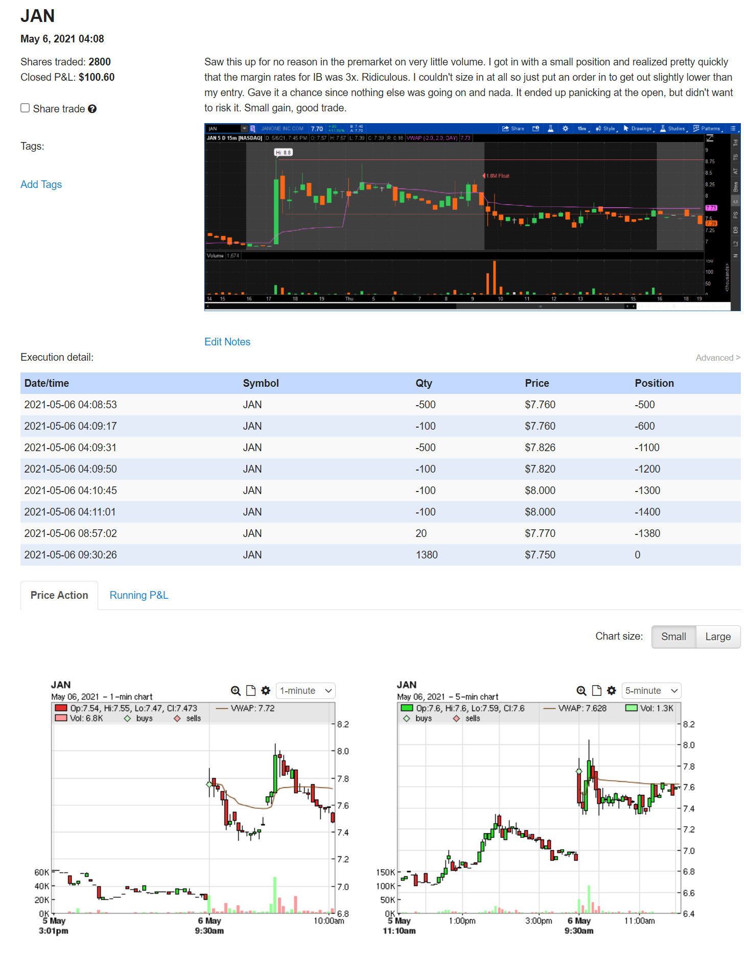 Saw this up for no reason in the premarket on very little volume. I got in with a small position and realized pretty quickly that the margin rates for IB was 3x. Ridiculous. I couldn't size in at all so just put an order in to get out slightly lower than my entry. Gave it a chance since nothing else was going on and nada. It ended up panicking at the open, but didn't want to risk it. Small gain, good trade.