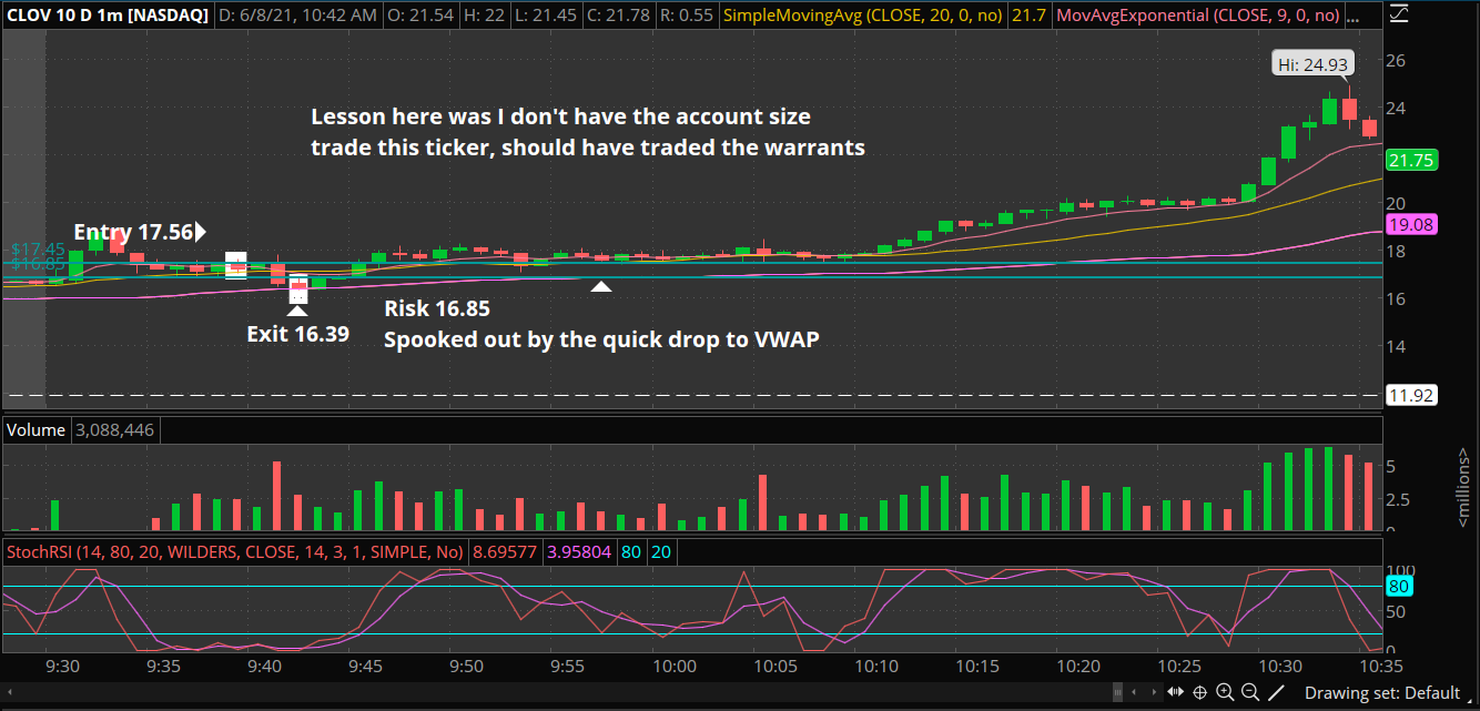 Right idea bad timing. I'm happy with setup and trade. Still working on my patience during a pull back. Found StockJock on YT thru MattDiamond on insta. Watched a bunch of his videos on YT about his CoC pattern and it's a pattern I notice quite frequently. Worked here just ended up getting spooked. Will continue to test.