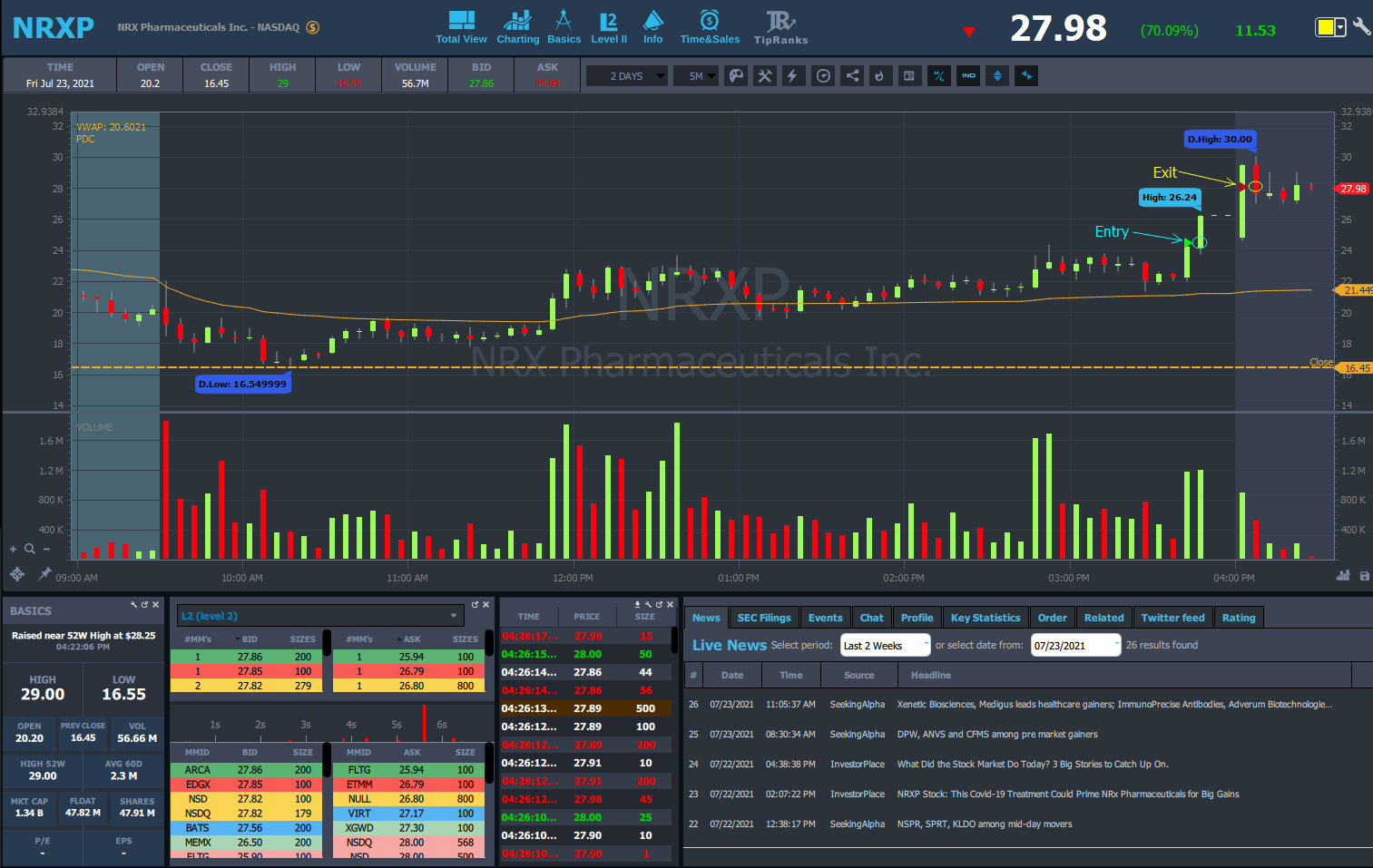 Entry - bought HOD break, no news, IPO'd about 1 1/2 months ago, 1x+ float rotation, looking for continued upside Exit - halted just about 13 minutes before close, unhalted just after close, I had to let my sell orders I placed during the halt expire before I could put in a sell order for extended hours, exited with a green trade