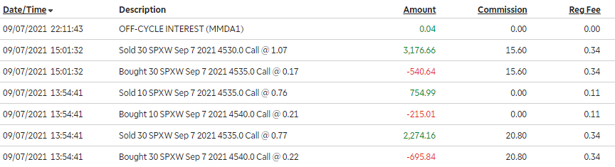 Two call positions at the end of the day, one with 30 contracts at 4540/4535 and another for 40 contracts at 4535/4530. I need to watch the position effect, however, as by doing overlapping positions like this my platform interprets that as creating one wider strike (4540/4530) instead of two narrower ones.