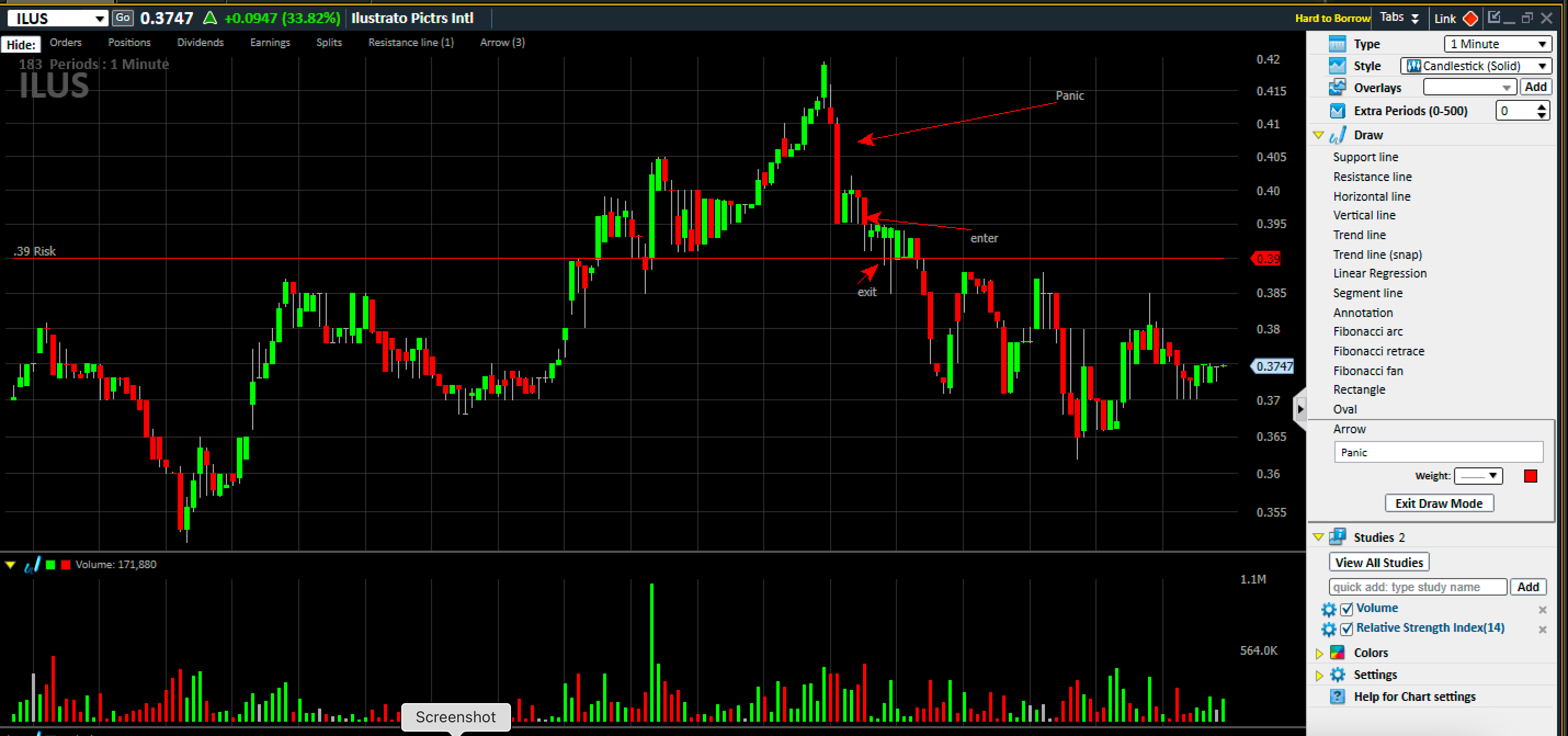 Not the best. Saw the panic candle but I still expected price to go Higher- Something I need to work on- I saw a turn and took it and set my risk at .39. Saw it get touched and looked to exit when I saw the bid thin out before another large panic sets in. Need to work on thinking about better support areas when a panic sets and wait for the correction to finish.