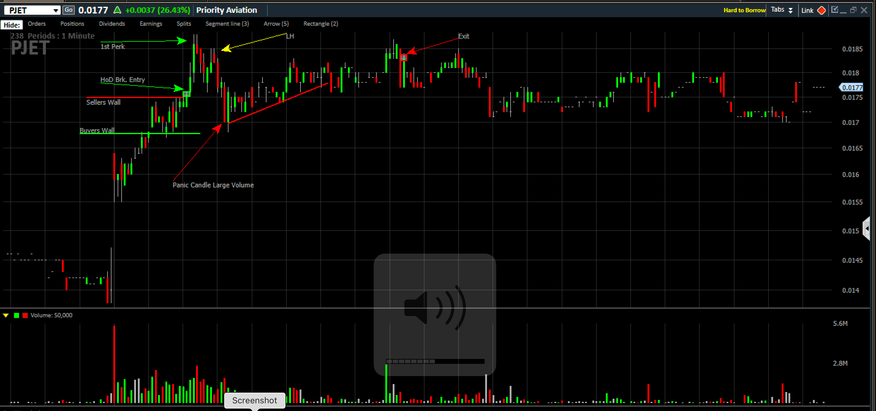 Saw this runner testing new highs with wall of sellers. Saw it chipping, since a good risk point was so far away and didn't expect price to fall to wall of buyers I did a HoD entry to ride the spike. Saw first two turns happening but wanted to play it out because I saw Hidden Buyer Soaking up bids on my Level 2. Well once again saw a panic candle variation, thought to play it off as a dip buy and of course didn't and held through consolidation. Good learning for first time pattern