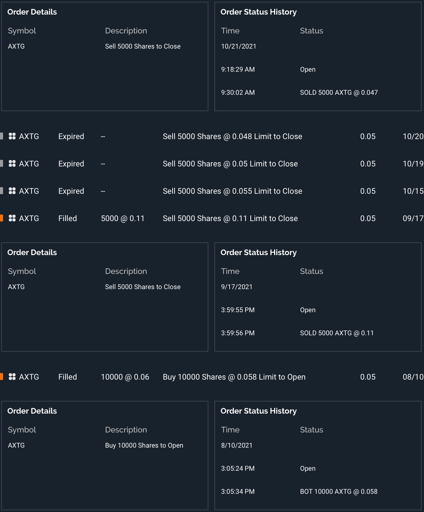 Not a good trade. Held too long and instead of selling 100% for a really nice gain, greed set in. I sold 50% at 0.11 on 9/17 which is over 89% gain. Kept 50% as I heard chat of upcoming catalyst which would continue to push this stock higher. Instead I let this fade even below my entry point and selling the remaining at 0.047. Minus fees my avg selling price was 0.076895. Need to develop a game plan and stick to it and cut out the noise.