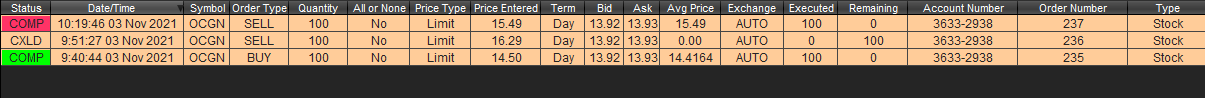 OCGN panic at open, entry $14.50 area ***risking off $14 whole dollar*** Pre-Trade-Thoughts; SPY, big markets are ready for a pullback along with some of these runners. OCGN has a history of having multi-day runs, so plan was to expect 5-7% red move, execute 100 shares on the dip with expectation for bounce red to green; took profit early for 7.45% gain
