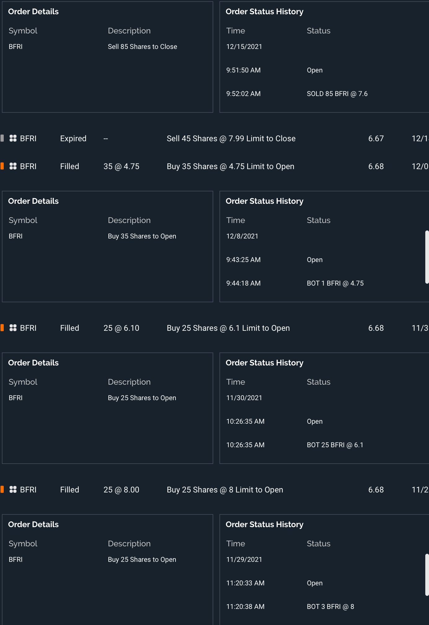 Low Float w/ news. Bought 25 @ 8.00 on 11/29, add 25 @ 6.10 on 11/30, add 35 @ 4.75 on 12/8. Total 85 shares avg 6.10. This was frustrating as I watched this fade and then shoot up to 8.25 and didn't exit, the next day shot up to 7.91 didn't exit and faded into the 5s, shot up to 7.89 today, looked toppy and sold @ 7.60. Need to be disciplined in taking singles and not listen to chats about going much higher.