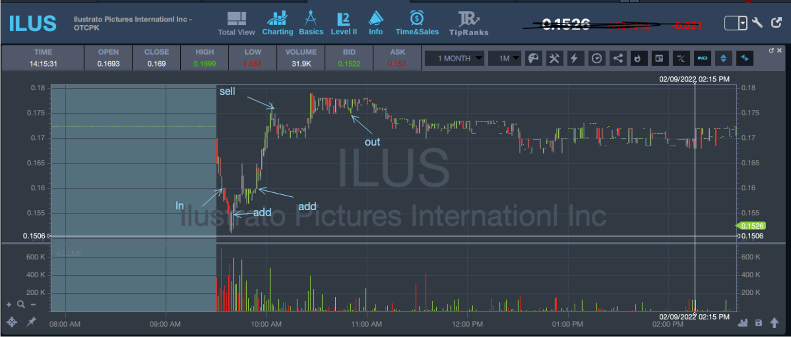 My goal was to dip buy it around 0.1. But it bounced hard from .16 yesterday. So I thought it would still take another week for it to dip to .1 leve. So I wanted to see if it can bounce around .15-.16 today. That's the plan. It paniced as soon as the market open, so I decided to buy when the volumes max out. However, it turned out I was early. Luckily I didn’t size in much. I did my first add when it actually bounced. Then another add on its way of bouncing. Got out with nice gains.
