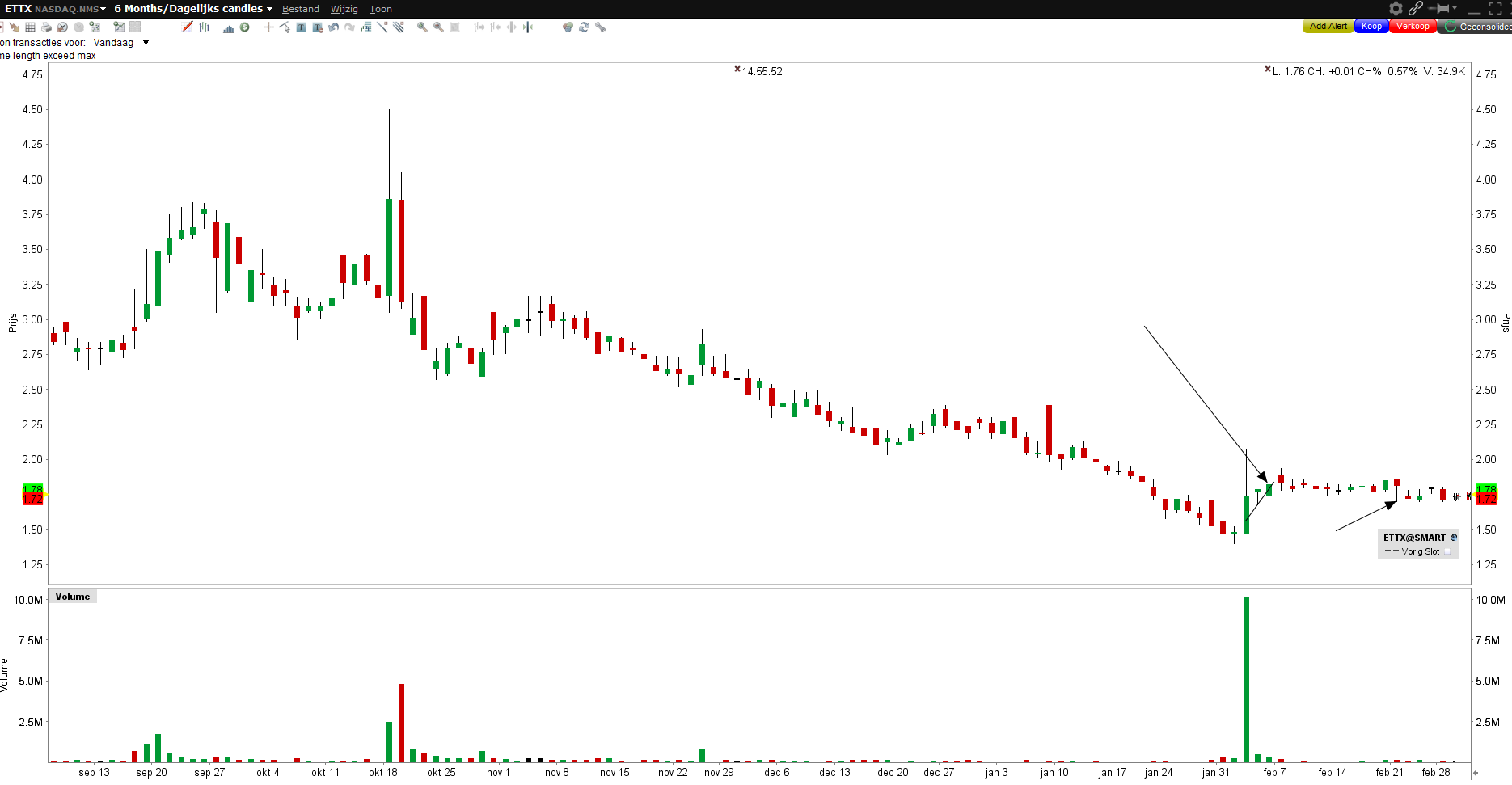 ENTRY: Grote groene dag gehad met veel volume, ik verwacht dat het momentum van de downtrend breekt en een uptrend ontstaat. Ik swing vanaf 1.80 en heb mijn risk op 1.75. EXIT: Stock hield dagenlang het 1.80 level goed maar is vandaag uiteindelijk gesneuveld. Mijn stoploss werd automatisch uitgevoerd. LES: Vrijwel 2,5 week dit aandeel vastgehouden en uiteindelijk verkocht op 1.70 ipv mijn stop op 1.75 door laag volume. Nooit meer zulke lage volume plays doen want is saai en zorgt voor slippage.