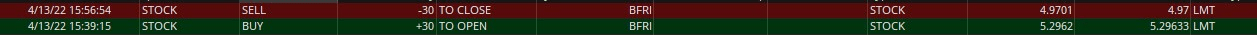 Initial plan was to buy into consolidation breakout at $5.20, risking $4.70 level, but price action blew past my entry and I didn't get filled. Then wanted to buy breakout at $5.37, got filled at $5.30 which I was ok with due to lower avg. Price got stuffed. Never hit my risk, but it was at the end of the day and did not think price would recover. Sold into a small bounce just under $5.