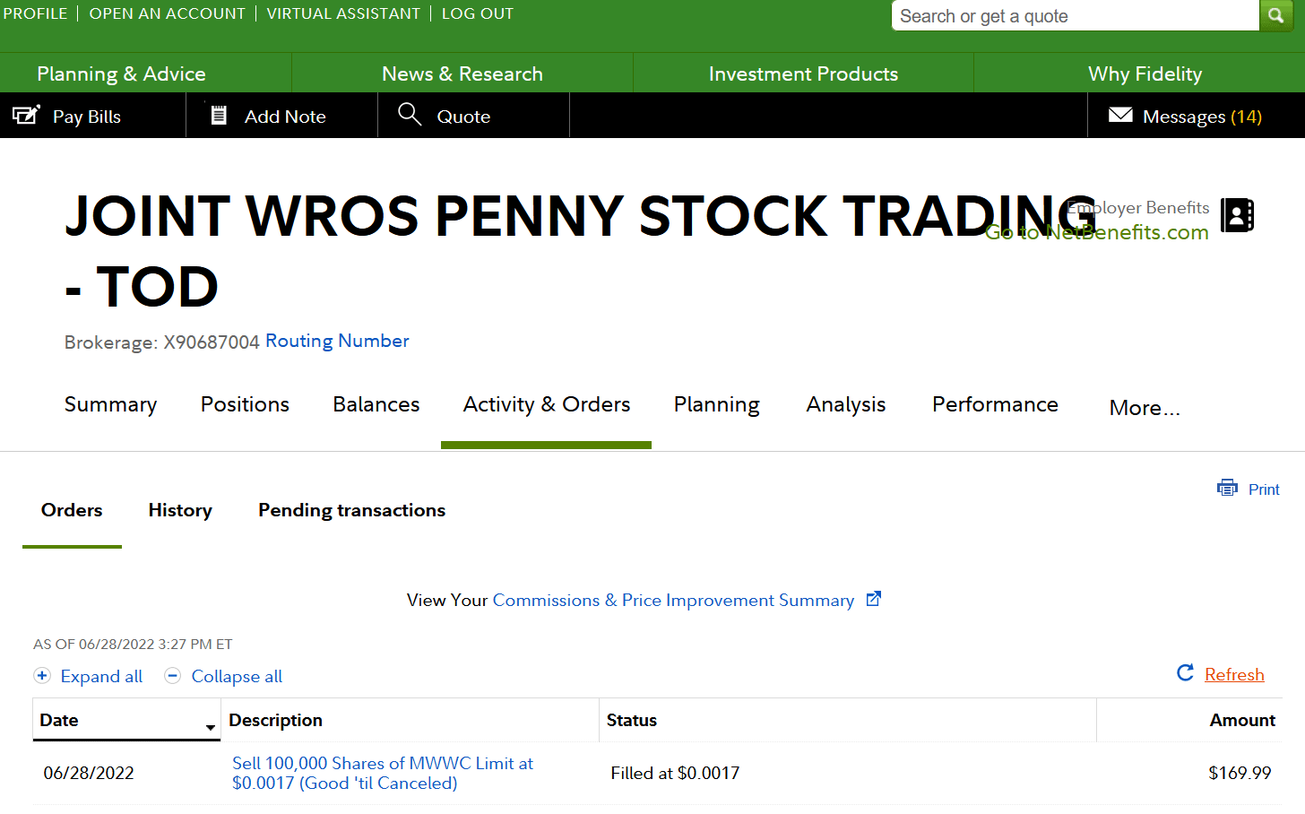 SUPER SALE STRATEGY per my 2/27/21 Profitly blogpost. Dip bought 6/14 10:56 $0.002 25k shares 43% off 6/13 $0.0035 HOD. Price kept falling so added 6/15 8:37 $0.0016 25k & 6/16 9:52 $0.0012 50k for 100k shares total at $0.0015 avg. Price spiked 6/28 and hit $0.0017 at 13:51. After many shares sold on the Ask at $0.0017 for ~30 minutes with no b/o, I got out 14:24 $0.0017. Price is $0.0015 at 14:57.