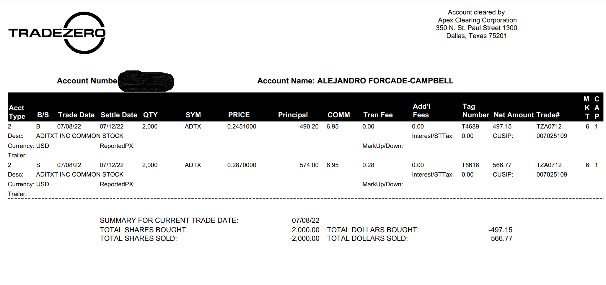 I bought it after confirmation on BNC (ADTX(0.235/+46.88%) Up over 50% after my 8:30 alert, Aditxt, Inc. Successfully Completes Preclinical Toxicity Study of Its Psoriasis Drug Candidate ADI™-100 Advancing it Closer to First-in-Human Trials). It was creating a basing around $0.23 and $0.25 and exited my position when I saw a change in price and a lot of selling orders on the time and sales chart.