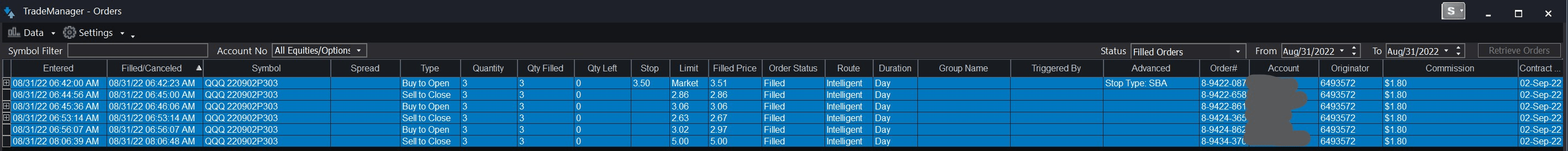 Stupid execution on a great idea. I saw that QQQ had risen overnight and due to market generally trending down decided a put was in order. However, using TradeStation's Matrix (a DOM ladder) I got confused and entered a market limit order at a higher price. I get confused with puts because down is up. I need to practice entering orders correctly with the Matrix price ladder or else just enter them the old-fashioned way, i.e., Tim Sykes method. He actually fills out an order ticket.
