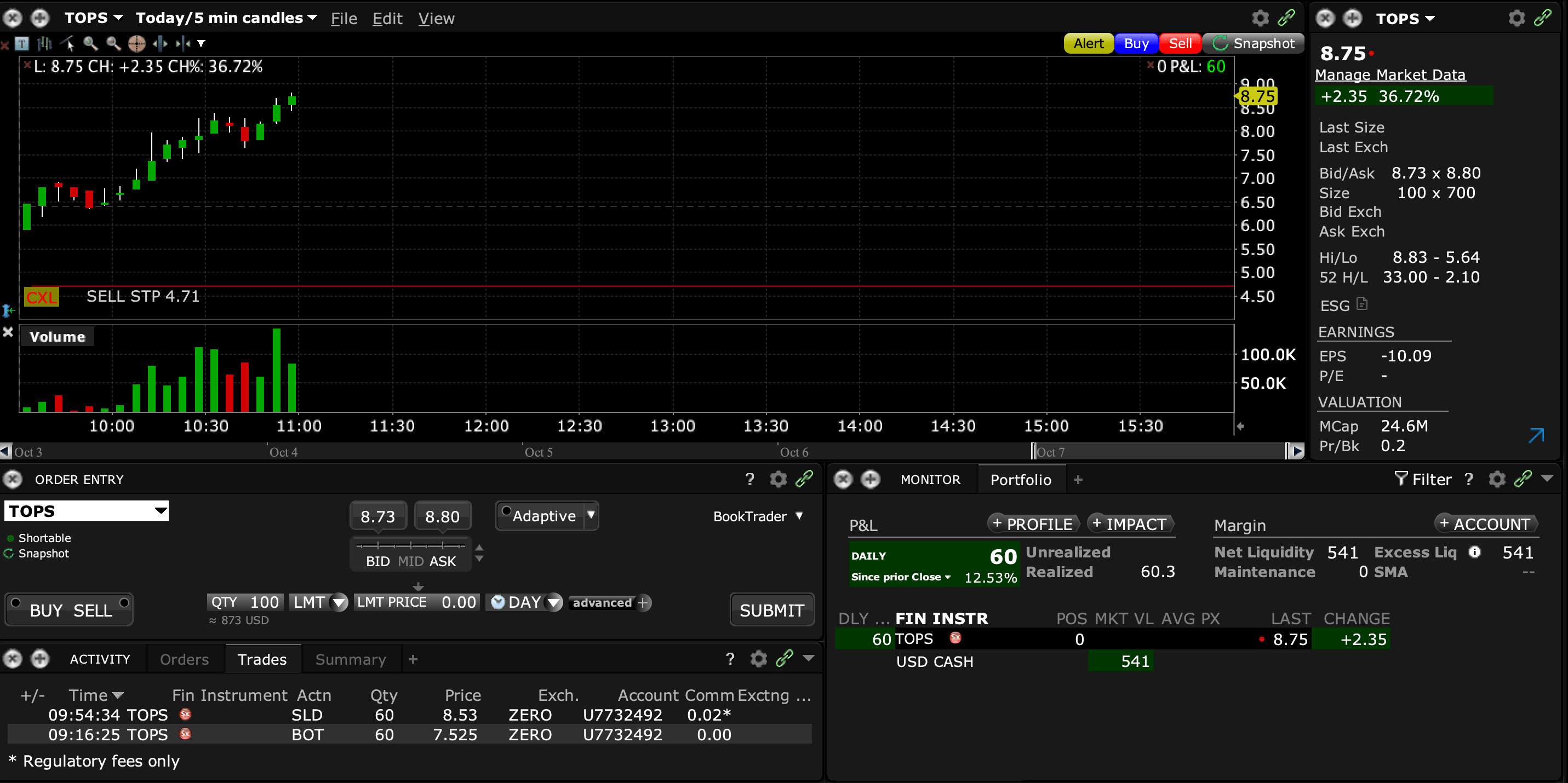 Once again, I think patience after market open is helping me trade more reactively to good opportunities which I think is contributing to my high winning percentage. I was extremely tempted to impulsively go long on a few top gainers today, but I waited and found TOPS had once again gained momentum and my risk reward was solid. I was certain it would go higher, but, as I've said before, I'm trying to develop the habit of taking substantial profits while I have them.