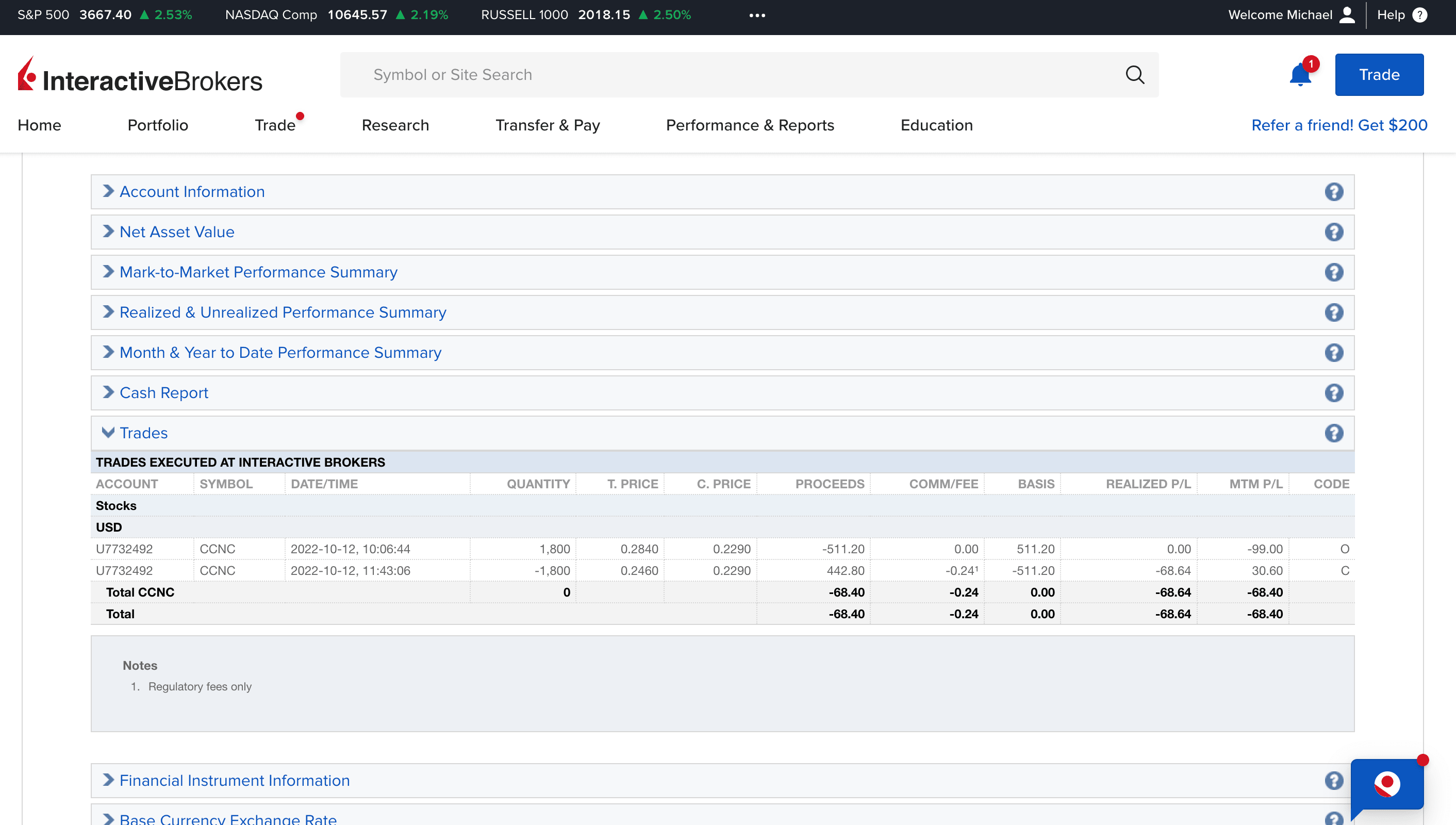 Not a bad trade, but I made a huge mistake which was that I did not sell while I had a $30 unrealized profit. This stock had substantial resistance around and just above $.30/share yet I held on gambling it would break $.30 and when it did not, I continued to hold because I had wed myself to my flawed hypothesis it would break $.30. It was also a huge mistake to not cut losses quickly. I should have called it with a $30 loss. $100 swing here.