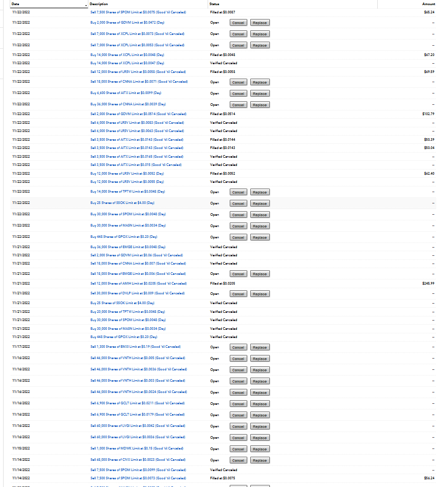 I got in this trade because it had spiked to OTC Biggest % Gainer with Volume on STTBN alert. Dip bought 11/14 14:37 $0.0066 15k 30% off 13:09 $0.0093 HOD and at b/o support using a pre-set Limit Buy. Price went sideways. On the re-spike sold 7.5k 11/22 12:17 $0.0075. When the bounce looked stalled there, I put in to sell the other 7.5k at the same price when a massive sell at $0.0076 went off without me then Fidelity gave me 12:20 $0.0087 top tick woo hoo!