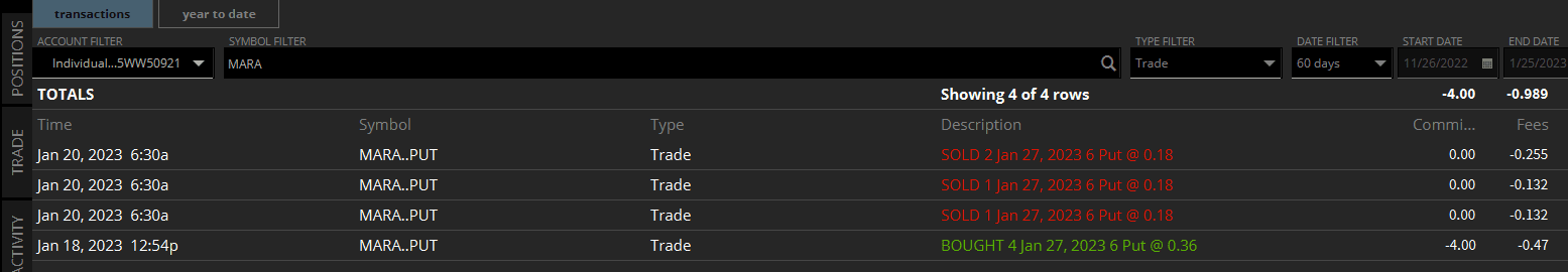 I bought these MARA puts as a hedge for my crypto portfolio. It looked like BTC was going to pull back, and I wanted to preserve my $1500 in profits in all my crypto wallets. Turns out, I didn't have to worry about it. Not sad at all about losing the $70 in insurance to keep those profits safe. Tastyworks