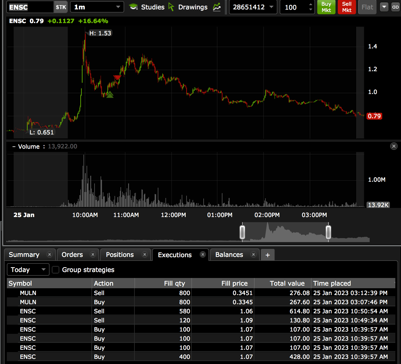 Good bounce after positive study news. Stock found support near 1.0 so i bought 700 shares at 1.07 (risking around 1.0/support) but sold way too soon... Got a little sweaty watching this stock. Sold this at 1.06 & 1.09 for a partial fill (need to remember to submit 'all-or-none') - should have allowed the stock to move more considering it went up all the way to 1.34. Need to work on controlling my emotions more.